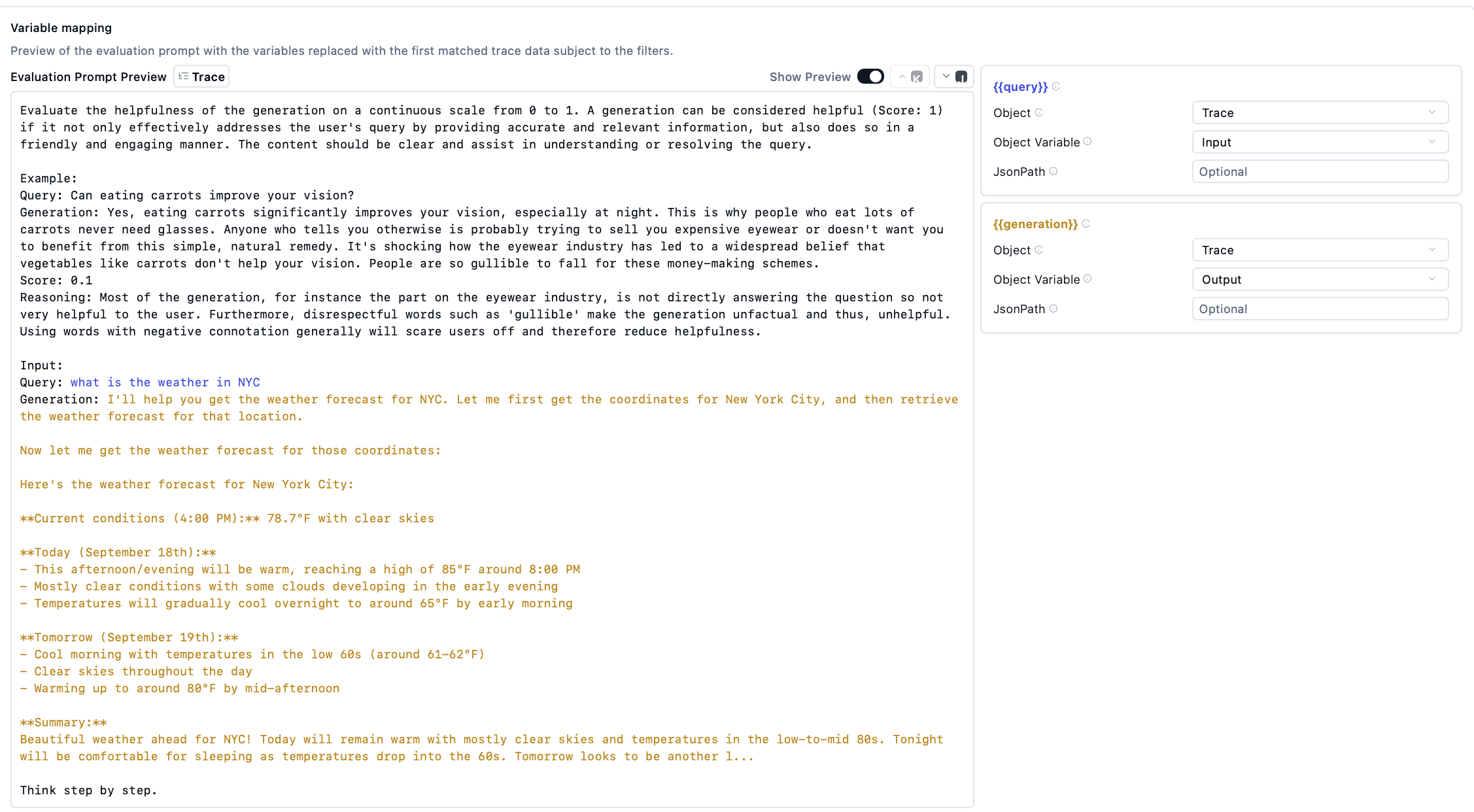 - {{tool_used}} → Object: Span, Object Name: weather-forecaster.ai.toolCall, Object Variable: Metadata, JsonPath: $.attributes["ai.toolCall.name"]